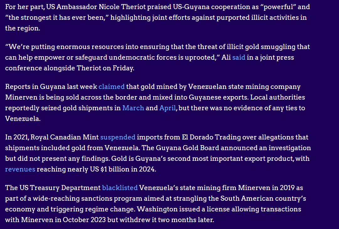 If Maduro has to pay the Guyanese mafia to broker his doré, and on top of that, the Guyanese themselves receive a discount to spot for their gold doré because of KYC/AML limitations imposed by Western mints and refineries, then Maduro's junta, with gold at record prices, face catastrophic losses by not capitulating to Trump.